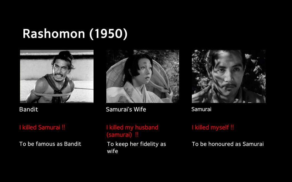 For a long time, I have reflected on how to visually reinterpret the Rashomon effect, particularly by connecting it to memory distortion and psychological transience. My reinterpretation is this: each character recalls or testifies to events in a way that benefits themselves, and in doing so, the visual elements of their memory become distorted—emphasizing what they wish to highlight, whether consciously or unconsciously.