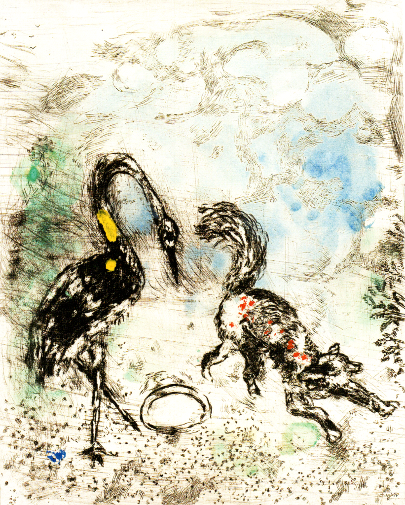 This interest soon led me to revisit Aesop’s Fables, which also deliver moral critique through humor, and I explored Marc Chagall’s illustrations of the fables for additional visual inspiration.