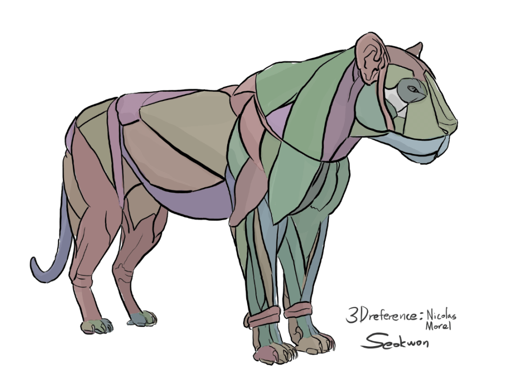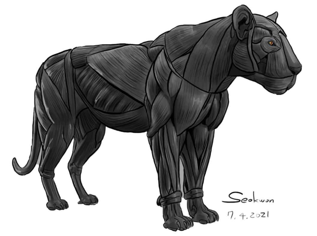 While drawing, I observed that the lion’s neck muscles are much thicker than I initially expected. The neck is one of the most vulnerable areas for most animals, which likely explains the evolutionary development of strong, dense neck musculature. For example, when humans sense a threat, they instinctively raise their shoulders and lower the neck, reducing its exposure. Similarly, when a lion is in a defensive or aggressive posture, its body lowers and the cervical vertebrae align with the spine, minimizing the neck’s visibility and protecting it from potential attacks.