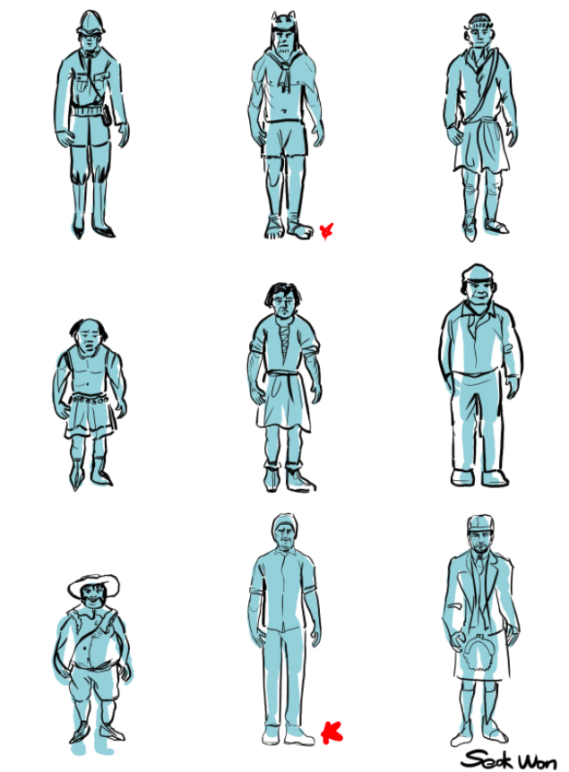 While working on the thumbnails, I realized that the more visually complex or layered the clothing, the more the essence of the character became obscured. Simplicity, in contrast, revealed more about the character’s raw identity. For example, the second character design—featuring a furry hat, no shirt, and simple shorts—felt more compelling. The minimal clothing made the character feel more grounded, unpretentious, and visually clear. This taught me that restraint in design can often result in stronger storytelling through visual language.