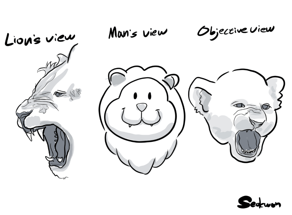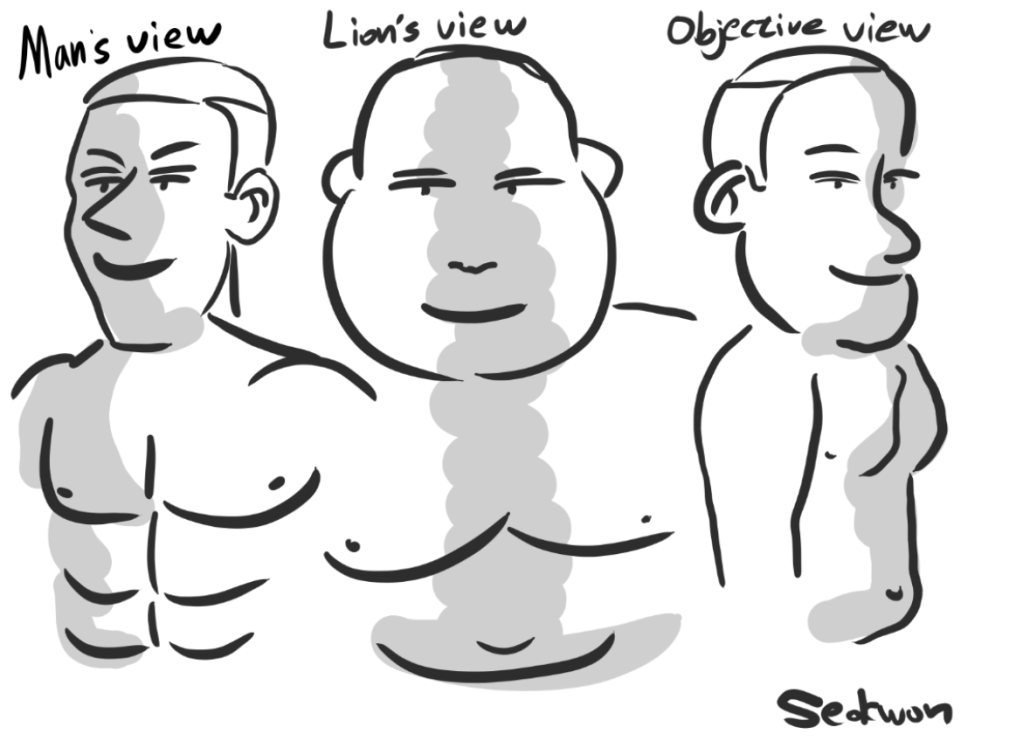 From the lion’s point of view, he sees himself as a terrifying and powerful beast, while perceiving the man as a clumsy, overweight, and incompetent figure. In contrast, from the man’s perspective, he envisions himself as a strong, muscular hero, and sees the lion as nothing more than a small, harmless, and even cute animal.