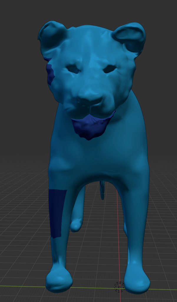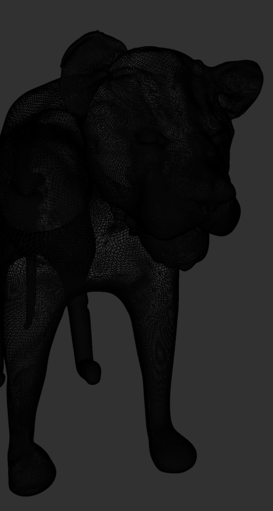 In my experience, when a mesh appears visually incorrect in Blender or Unity, the issue can often be fixed by using Edit → Recalculate Normals (Outside) in Blender. However, in this case, after recalculating the normals, the lion mesh turned completely black, as shown in the image on the left. At that point, the mesh lost all visible detail, and it was no longer recognizable as a lion.