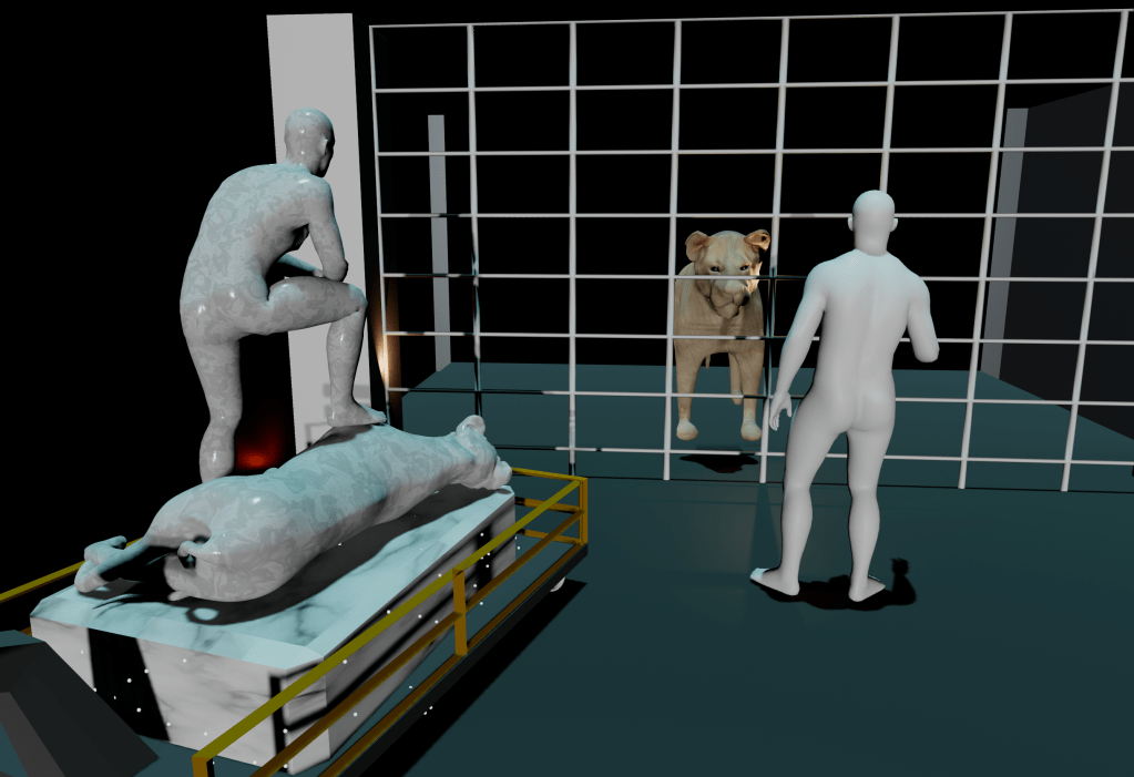 In the tenth week, I implemented Fumio Hayasaka’s piece “Tryst” into the game engine, which enhanced the overall mood of the game. I also programmed a portal system that allowed players to switch perspectives—from the man’s point of view to the lion’s.