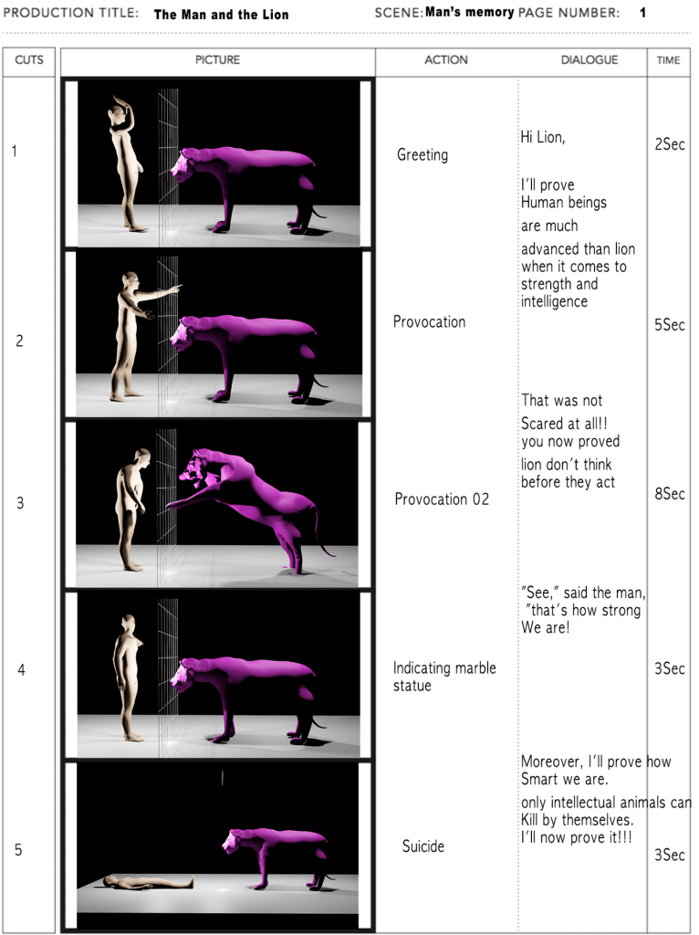 Still, I felt limited in expressing the theme of memory distortion, since the man’s dialogue from his own perspective and the man’s dialogue as recalled by the lion ended up being almost identical. This lack of divergence made it difficult to fully explore the subjectivity and unreliability of memory, which was a central theme inspired by Rashomon.