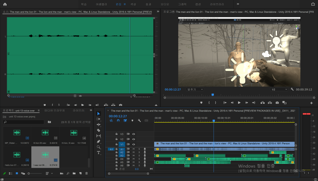Ms. Ali’s narration was implemented using a 2D sound effect, allowing the voice to be heard at a consistent volume regardless of the player’s position in the game space. In contrast, a 3D spatial sound was applied to the dialogue between the man and the lion, so that the volume dynamically decreased as the player moved further away from the characters—creating a more immersive environment.