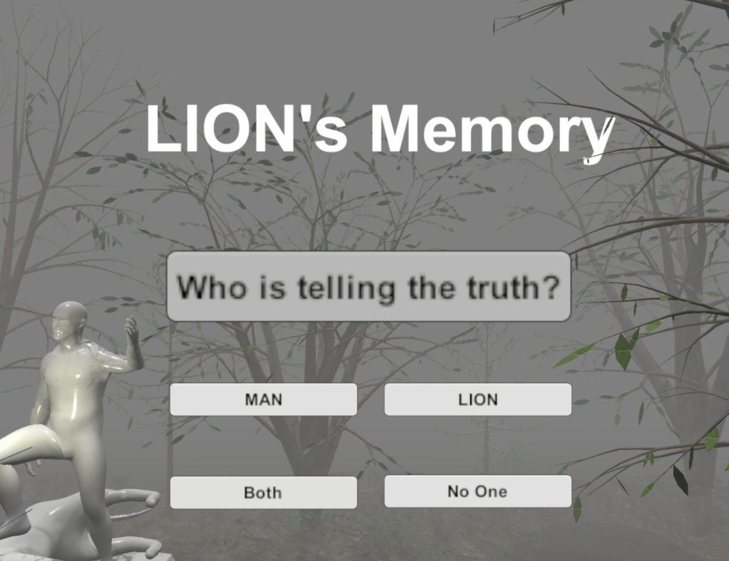 I designed a final UI scene asking the player “Who speaks the truth?”, which serves as the ultimate goal of the game. As the player chooses to believe either the lion’s or the man’s version of the story, one of their claims becomes the “truth.”
