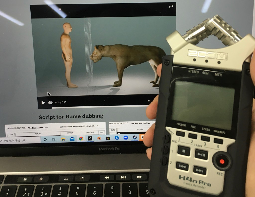 Each line in the script was recorded at least three times, using different tones and emotional deliveries to find the most fitting expression. In addition, I recorded sound effects such as the man’s scream during the lion attack and the sound of the man taking his own life, to heighten the emotional impact.